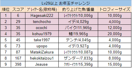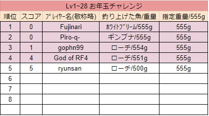 mattoko Posted January 8, 2021 Author Share Posted January 8, 2021 1/08 22:15 途中経過 たくさんのご参加ありがとうございます!終了まで時間ありますので、投稿がまだの方はお急ぎください。 告知: 1/14(水)もしくは1/15(金)から1週間、同じような形式で"シルバーチャレンジ"を開催予定です。 トーナメントや週間チャレンジといったイベントと期間が重なる方もいらっしゃると思いますが、ご自分の釣りをしながら参加して頂ければ幸いです。 また、フィードバック/提案をいつでも受け付けておりますので、何かございましたらお気軽にお申し付けください。 3 Link to comment Share on other sites More sharing options...